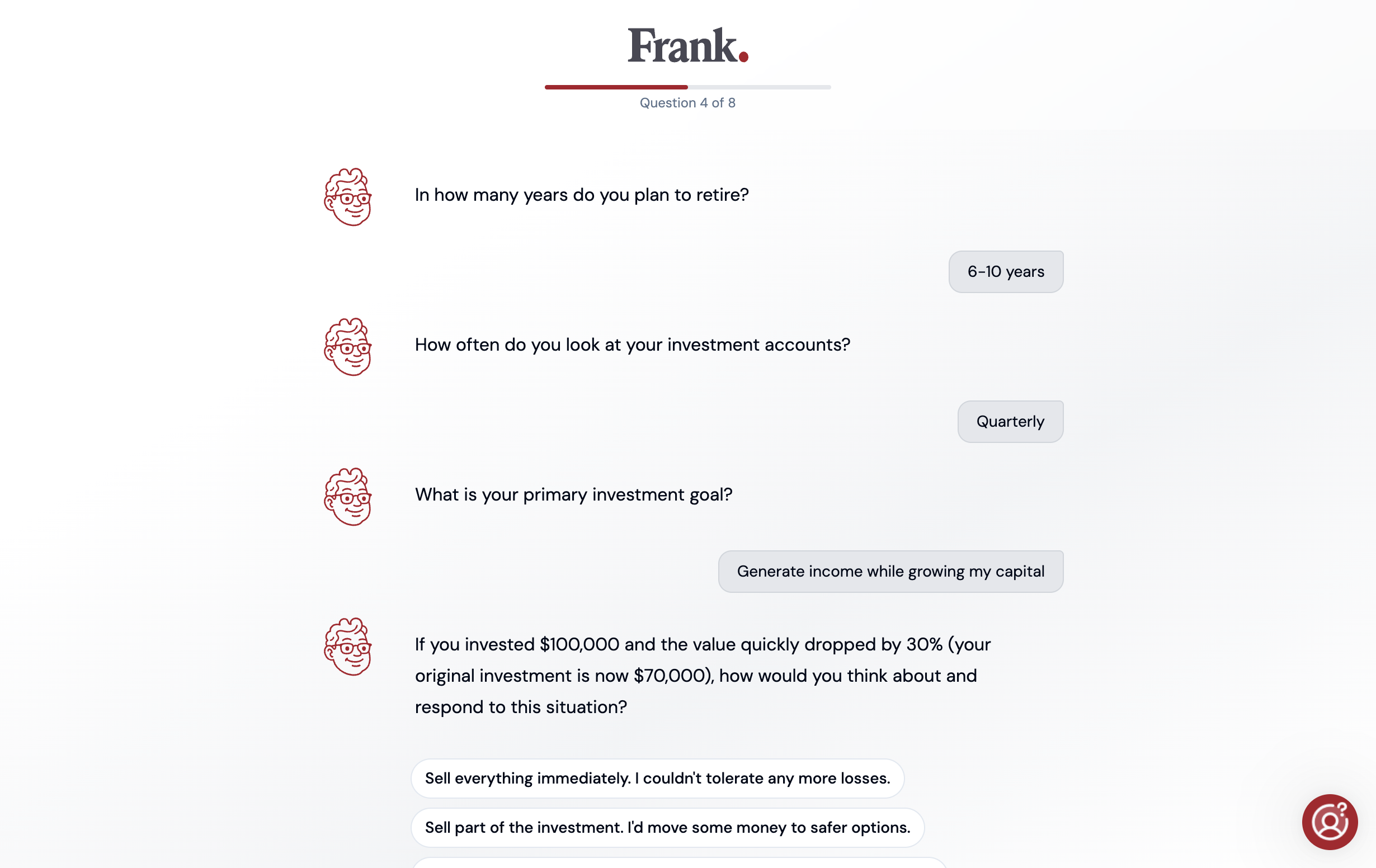 Frank now has a chat-based Risk Tolerance assessment. When it comes to investing, it’s important to know your risk tolerance when providing advice. If you ask Frank for advice that he needs this for, he’ll prompt you to complete it before continuing.